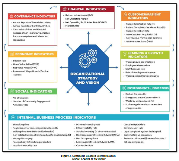 Healthcare leaders have acknowledged the significance of the balanced scorecard framework in establishing a connection between clinical and organizational practices, outcomes, quality, value, and cost. However, despite its adoption, the emphasis of balanced scorecard users has primarily been on enhancing quality and processes while simultaneously maintaining the financial performance of the organization. As a result, the causal relationship between performance indicators within the scorecard and their linkage to the organization's strategic objectives has been overlooked [8]. Furthermore, the absence of a well-defined structure for promoting social integration, as well as safeguarding economic and environmental interests, has a significant impact on providing sustainable healthcare services.