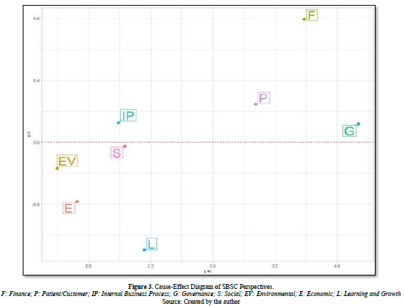 Using the Decision-Making Trial and Evaluation Laboratory (DEMATEL) method, this study investigated the connections between the various SBSC perspectives and the various important indicators. The perspective of finance (F) that exhibited the highest value of C-R demonstrated the most significant influence on the remaining indicators and was therefore deemed the primary "causal factor" among the perspectives. Subsequently, the customer/patient perspective was ranked second, followed by internal business processes and governance, respectively. The primary objective of private hospitals is to achieve financial gains. To attain this objective, private hospitals must attract a larger customer base seeking superior healthcare services delivered through efficient internal business processes. To ensure the long-term viability of private hospitals, corporate governance serves as a comprehensive framework.