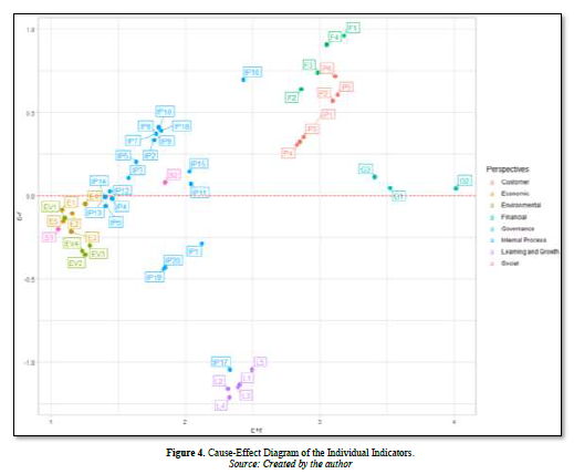 Additionally, the model can be characterized as a graphical representation in which the vertical axis (Y-axis) represents the values of (C-R), while the horizontal axis (X-axis) represents the values of (C+R). The utilization of the coordinate technique facilitates the determination of the respective relations and positioning of each factor in relation to a point on the coordinates, specifically denoted as (C + R, C-R). Figure 2 demonstrates the significant relations of SBSC perspectives, and Figure 3 illustrates the significant relations of indicators.