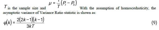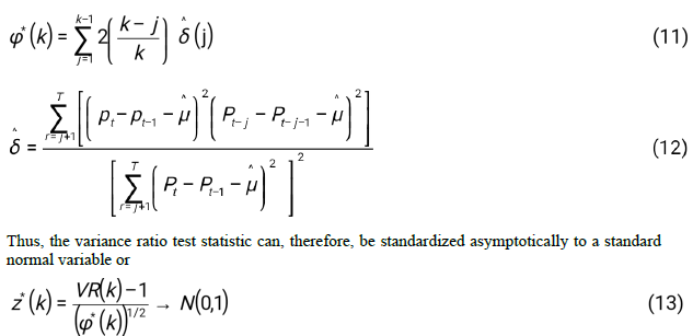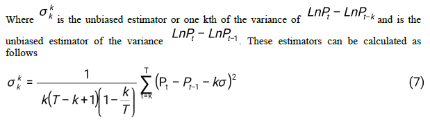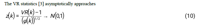which indicates the asymptotic nature of distributional equivalence, while various studies have argued that, in terms of time variance, returns are conditionally heteroscedastic. Theodossiou and Lee [24], Koutmos, Theodossiou and Lee [25] and Theodossiou, Koutmos and Negakis [26]. As a result, there may be no existence of a linear relationship over observation intervals. Lo and Mackinlay [3] derived the heteroscedasticity consistent variance estimators from overcoming this problem.