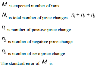 The run test is used to investigate the independence of returns. This test analyzes runs in a series of data sets by comparing the expected number of runs with the number of runs observed. The expected number of runs can be calculated as given by Wallis and Roberts [23].