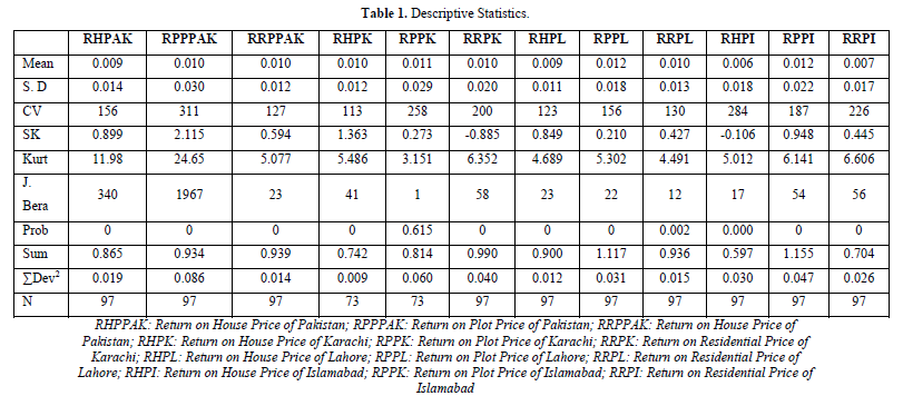 The Jarque Bera (JB) test further confirms non-normal distribution patterns, particularly in the returns of Pakistan's real estate markets, except for Karachi. This underscores the presence of significant skewness and kurtosis, deviating from the assumption of a normal distribution.