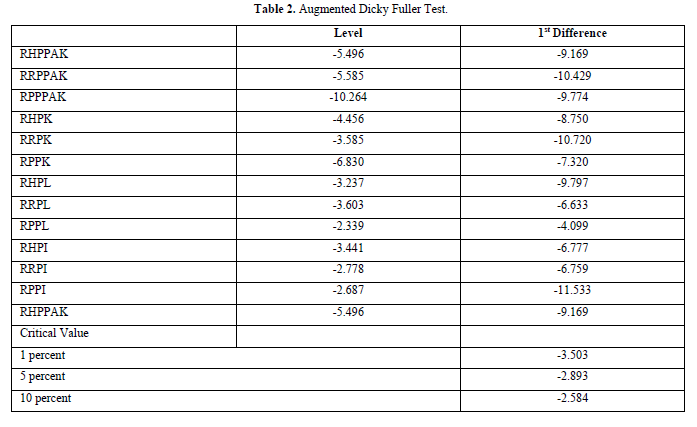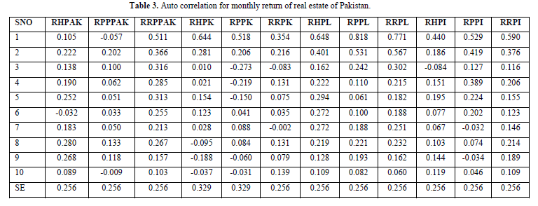 Table 3 provides the autocorrelation of monthly real estate prices. The autocorrelation test provides further insights into the persistence of real estate price movements, with positive autocorrelation observed at lag 1, the autocorrelation is positive and exceeds twice the standard error, specifically at 0.256 for RPPPAK, RHPK, RRPK, RPPK, RHPL, RRPL, RPPL, RHPI, RRPI, and RPPI. This suggests deviations from a random walk pattern, particularly in plot prices in Pakistan and specific city returns.