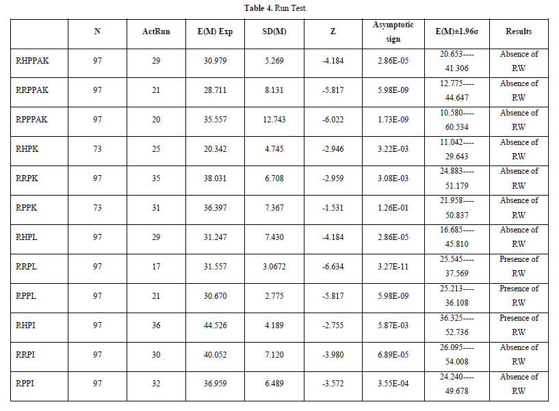 Table 4 presents the results of the Run test. The results indicate that the z statistics for monthly returns, both for overall real estate prices in Pakistan and for specific cities, exceed ±1.96 and are negative. However, the observed number of runs falls short of the expected count, with a statistically significant level observed across Pakistan's real estate market. Moreover, if |Z| > 1.96 at the 5% significance level, it suggests that the series lacks randomness. This criterion applies to all return series of Pakistan's real estate prices except for RPPK, indicating a departure from the random walk hypothesis in Pakistan's real estate market.