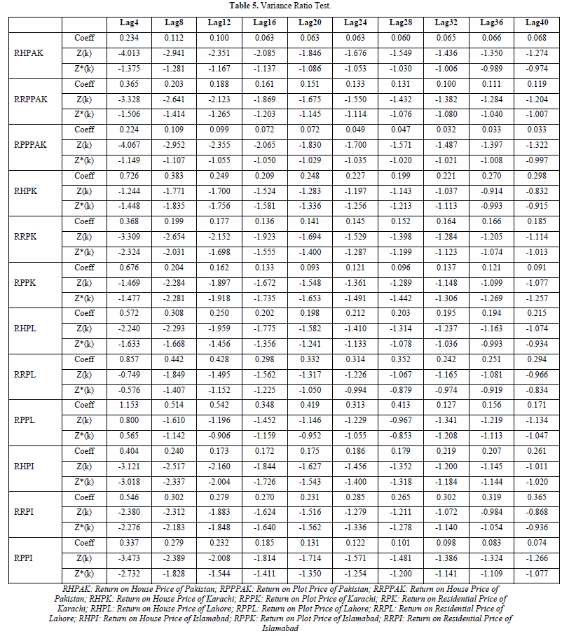 The null hypothesis of the random walk suggests that the variance ratio equals one. Deviation from this value implies a mean reversion in real estate prices. The variance ratio test diminishes with increasing lags in all the chosen real estate return series for Pakistan. With the exception of RPPL, whose variance exceeds one, all series exhibit a variance ratio below unity, indicating a negative auto-correlation in monthly real estate returns. Only RPPL, representing returns on plot prices in Lahore, exhibits a positive serial correlation with monthly real estate returns.