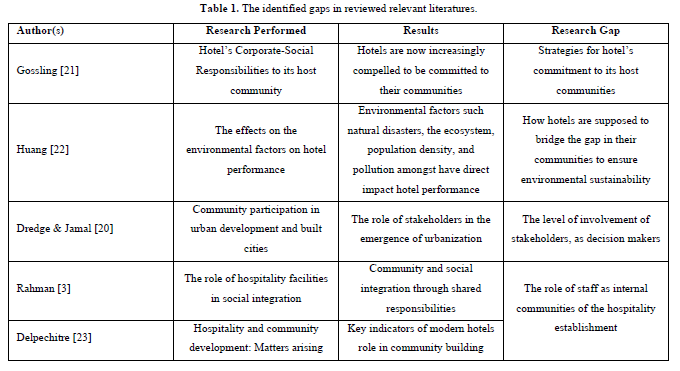 The effects on the environment are also quite important. Degradation of local landscapes, pollution, and disturbance of flora and fauna are only some of the negative effects that may result from an increase in the number of tourists visiting an area [21]. When the number of visitors exceeds what the area can comfortably accommodate, problems with waste management, water shortages, and the loss of natural resources might occur. Hotel development may be beneficial to local economies, but there are also drawbacks that must be considered and addressed. In instance, excessive tourism may result in congestion, resource depletion, disputes, the commercialization of culture, and environmental damage. To maintain the long-term success of host communities, it is crucial for destination stakeholders to use sustainable tourism strategies and to manage the consequences of tourism properly. Table 1 shows the identified gaps in reviewed relevant literatures.