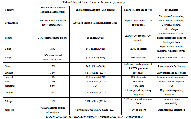 Table 2, presents a country-by-country tabular analysis of general intra‑African trade performance including trade in manufactures among AfCFTA member countries, using the most recent available data across various metrics. South Africa remains the dominant manufactured goods exporter, with machinery, vehicles, and equipment leading its intra‑African trade. As top intra-African trader, its main partners include Nigeria, Namibia, Botswana, and Mozambique. Nigeria and Egypt, despite being commodity-heavy, still have strong intra-continental manufacturing-oriented trade components (about 25-31%). Nigeria is the 4th largest intra-Africa trader with exports side-edge but low import share. Nigeria’s exports to Africa more than doubled in 2024, to N8.74 trillion from N3.71 trillion in 2023 (though a mere 4.2% of its total exports and 3.0% of its total imports), making Africa an emerging export destination [36]. It could be deduced that the top country contributors in 2024were; South Africa, Egypt, and Nigeria - the key exporters of manufactured, industrially processed goods within Africa. Smaller economies (Kenya, Ghana, Senegal, Rwanda, Mali, etc.) typically export a higher share of manufactured goods from +7% up to 26%. From the foregoing analysis, manufactured goods constitute a meaningful and growing slice of intra‑African trade under AfCFTA, representing around a quarter of exports. Leading countries like South Africa, Egypt, and Nigeria drive this, but numerous others show strong industrial trade potential. These statistics imply that Africa is gradually becoming strong in terms of manufactures and economic integration.