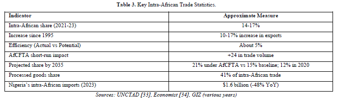 In terms of short-run impact, Table 3 suggests that AfCFTA could boost intra-African trade by 24% in trade volumes. This means that long-term gains will likely be higher. Without additional policy steps (pre-AfCFTA), intra‑African share would modestly rise from 12% in 2020 to 15% in 2035; but with AfCFTA, the forecast is 21% by 2035. Table 3 also indicates that 41% of intra-African trade comprises processed goods when compared to just 17% in extra-continental exports. This is on a positive node, suggesting greater value addition when African countries trade among themselves because higher trade correlates with improved GDP per capita and stronger financial markets. This further corroborates the findings by Ogbaji and Ebebe [28]. On the import side, for instance, Nigeria’s intra-African imports fell to US$1.6 billion, a drop >48% from 2022, ranking sixth in Africa. This is an indication that the giant of Africa (Nigeria) could do better.