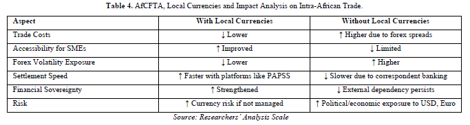 Despite the advantages of PAPSS, Table 4 reveals that there could be challenges such as foreign exchange volatility exposure in the process of deploying African currencies. Many African currencies are volatile or suffer from inflation, making them unattractive for trade settlement. It is likely that traders may resist using weaker currencies or face price uncertainty. For example, Zimbabwean dollar or Nigerian naira volatility may deter their use in cross-border trade. This has corroborated the submission by IMF [20] that exchange rate volatility diminishes trade. Moreover, most African currencies are not freely convertible, and requires central banks to develop bilateral/multilateral clearing mechanisms or use units of account such as African Monetary Fund proposals. Based on currency strength, stronger economies in Africa such as South Africa, Egypt and Morocco may dominate trade balances, creating pressure on weaker economies’ forex reserves if not well managed.