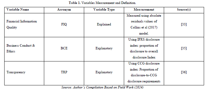 Business conduct with ethics and transparency has been employed as the independent variables of the study while financial information quality (FIQ) was used as the outcome (dependent) variable of the study. The study covered a period of five (5) years spanning from 2018 to 2022. The choice of the five (5) years period was because of the fact that the researcher restricted the study to Nigerian Code of Corporate Governance 2018.