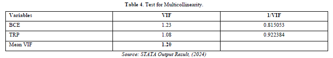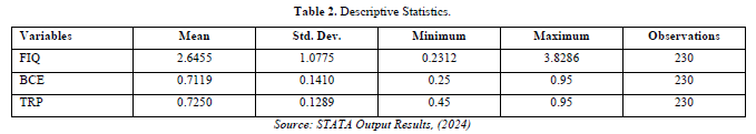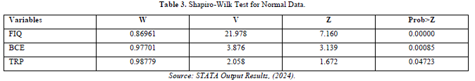 From the result in Table 3, it presents the normality test in respect of all the variables of the study as given by (Financial Information Quality, Business Conduct and Ethics, Transparency) Specifically, the null hypothesis of the normality principle state that the data are normally distributed. Based on the result of the t-statistics (Z-Scores) are statistically significant at one percent (1%) level of significance. By exception, only transparency (TRP) is statistically significant at 5 percent (5%) level of significance. The implication of this is that all the variables were normally distributed.