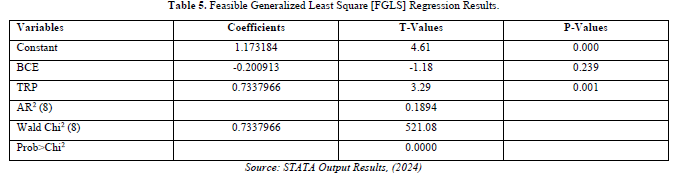 Based on the regression results in Table 5 it clearly shows the adjusted R2 value of 0.1894. This signifies that the coefficient of determination has a cumulative explanatory power of 19 percent (19%) approximately. By implication, the total impact or changes in the financial information quality of listed consumer goods firms in Nigeria is caused by the Code of Corporate Governance proxied by Business Conduct and Ethics (BCE), and Transparency (TRP) during the period of the study. The result also implies that 81 percent (81%) of the total changes in financial information quality was caused by other variables not captured in the econometric model of the study. Even though, the 19 percent AR2 was considered to be moderate for (having large impact) as advocated by Cohen (1988). On the contrary, it is highly interesting that same AR2 value was considered “Adequate” by Falk and Miller (1988). The regression results also show a Wald Chi2 value of 521.08 signifying that the explanatory variables are properly selected combined and used. The result also implies that the model is good, adequate and well-fitted for the study. This is confirmed by the prob>Chi2 value of 0.0000 which signifies that it is statistically significant at 1 percent (1%) level of significance.