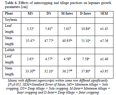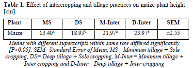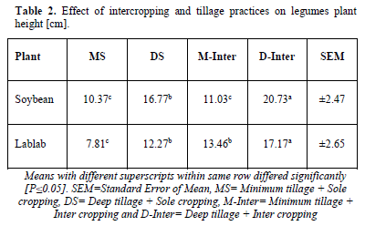 According to Table 2, there was a significant [P<0.05] difference in forage legume plant height derived from tillage and cropping techniques. Under deep tillage, soybean intercropped with maize resulted in to high plant height. On lablab grown as a sole crop under minimum tillage, the lowest plant height was recorded. The increased plant height may be due to improved soil texture by deep tillage which allows easy air circulation and nutrients for plant use. The findings of the present study differ from those of Belel [12] and Karanja [13], who suggested that the shade of the legume crop by the taller maize plants contributed to the decrease in terms of plant growth indices like plant height under intercropping system.