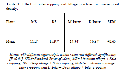 Table 3's display of maize plant density showed some significant [P<0.05] difference between treatments. On intercropped maize and legume fields with deep tillage, the highest plant density of maize was observed. The findings of this study are consistent with those of Shyamal and Bikas [3], who found a comparable pattern in increasing plant density of maize intercropped with a legume plant. Similar to this, greater plant numbers in maize intercropped with a soybean were also documented [12]. The results of this study, however, differed from those of Padhi and Panigrahi [14], who observed a declining trend in maize density with intercropped legume forage.