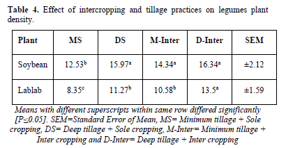 Forage legume plant densities were significantly different, as seen in Table 4. Highest plant density was recorded in legumes intercropped with maize under deep tillage. Under deep tillage, soybean had the highest plant density, followed by lablab, and both were intercropped with cereal plants. The lowest plant density for legumes was found in a lablab under sole cropping and minimum tillage. According to the current study's findings, deep-tilled soybean intercropped with cereal plants had maximum plant density. The results are consistent with those of Bagegnehu [1], who noted a rise in the number of legume plants intercropped with cereal maize. In a similar vein, Baldé [16] indicated that forage legumes intercropped with cereal maize resulted in to an increase in plant population.