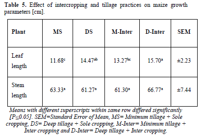 The length of the maize leaves differed significantly [P<0.05], although the length of the stems was not significantly different across all treatments, as shown in Table 5. Morphological characteristics of maize intercropped with selected forage legumes were highest under deep tillage, whereas sole maize under minimum tillage yielded the lowest leaf length. The findings of this study concur with those of Mucheru-Muna [17], who noted an increase in the morphological characteristics of maize intercropped with legume crops. Additionally, comparable findings were observed in studies by Leonard [18] and Shyamal and Bikas [3].