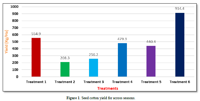 The practice of producing cotton from ratoon resulted in subdued seed cotton yield as this was evident from the results obtained. Ratooned plants on treatment one, two, three, four and five resembled better yield in the first year but the yield declined drastically in the second and third season. This was influenced by the build-up of pests especially bollworms leading to severe boll damage. Spraying and weeding became a challenge as the plants were now densely populated in the third season. A significant decline in the yields can be observed in such plants because ratooning causes crowding and the soil does not have time to get replenished. In general, the ratoon yields are lower as compared to the crop yields.