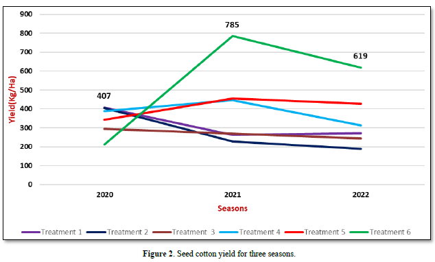 According to the line graph above (Figure 1), Treatment 6 had lowest seed cotton yield in the first year 2020 with 212 kg ha-1 and the yield rose up by close to 100% to 785 kg ha-1 in the second year as this was due to different amount of rainfall recorded in the two seasons. However, in the third year the yield slightly dropped to 619 kg ha-1 though it still remained as the highest yield when compared to the other treatments. In year 2020, Treatment 1 had highest yield with 407 kg ha-1 and in the next season it drastically dropped to 262 kg ha-1 and finally in 2022 it was at very low at 272 kg ha-1, this means that the yield on Treatment 1 started to drop in the following year (2021) after the ratoon practice had started to be initiated. Other ratoon practices from different treatments also produced comparable seed cotton yield results as they never exceeded 500 kg ha-1 mark. This simply implies that despite practicing different types of ratooning, they remain performing below the traditional practice of establishing a crop from seed.