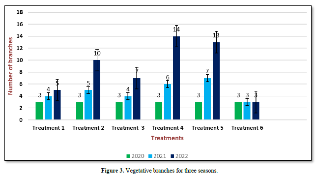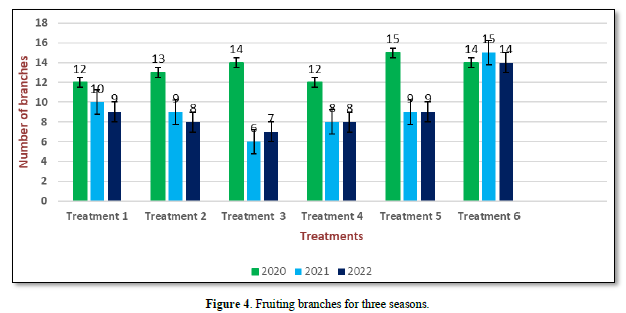 According to Figure 3 above, Treatments 1 to 5 had higher number of fruiting branches in the first year but later dropped drastically the following year (2021). As for Treatment 6, it maintained higher number of vegetative branches for all the three seasons and it contributed to higher seed cotton yield when being compared with the other treatments.