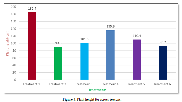 According to Figure 4 below, Treatment 2 and 6 has almost similar plant heights of 90.8cm and 93.2cm respectively as these were shorter plants. Treatment 6 was established from planting seed cotton and Treatment 2; the plants were cut from the ground level on the same day when Treatment 6 was planted. Treatment 3 to 5 had almost similar plants in height though they were much taller than Treatment 2 and 6 and the reason being that these Treatment 3, 4 and 5 had plants cut at different levels from the ground, so these were already established stalks which just regenerated as they developed new shoots. Treatment 1 had tallest plants with an average height of 185.4cm because these were unlashed stalks throughout the trial duration for three years so they kept growing taller (Figure 5).