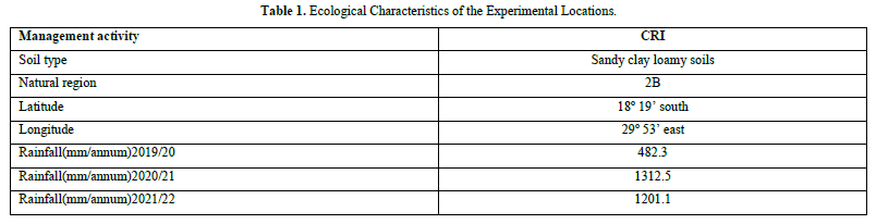 The study was conducted at Cotton Research Institute (CRI) from 2019 to 2022 season. CRI is situated near Kadoma in Natural Agro-ecological Region 2B on latitude 18o 19’ South and longitude 29o 53’ East. The altitude of the trial area was 1152m. The soil was sandy clay loamy. The selection of the location was influenced by the need to isolate the ratoon in order to minimize spread of pests and diseases to other cotton crops. Therefore, the trial area was separated from other potential cotton fields by a 200m gum plantation.