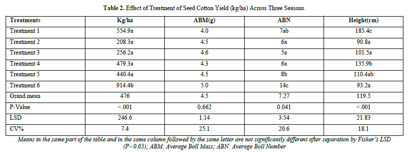Seed cotton yield was measured. Data for average boll mass, boll number per plant and plant height were collected for the purpose of explaining the performance of treatments in respect of seed cotton output. Analysis of data for the dependent variable was done using GenStat software 18th edition. In the final season an across three seasons analysis of data was performed. Means for seed cotton yield were separated using Fisher’s Protected LSD at 5%.