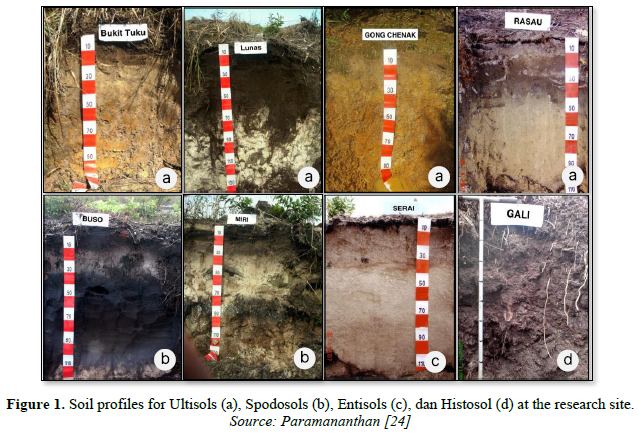 Histosols, also known as peat soil, differ fundamentally from mineral soils such as Ultisols, because they are rich in organic matter. Their formation process occurs through the accumulation of organic material in wet conditions and the absence of oxygen, resulting in distinct soil characteristics that do not follow conventional soil texture classification. In peat soil, there is a high proportion of organic material and water content, which play key roles in determining its physical and chemical characteristics. Therefore, categorization based on sand, silt, and clay becomes less accurate or even inapplicable in peat soil analysis, explaining why soil texture measurements are often excluded for Histosols in soil studies.