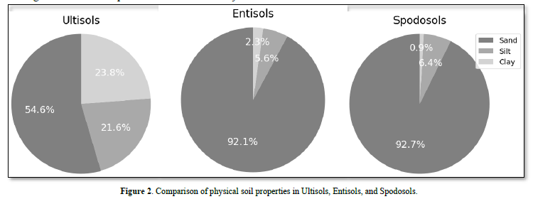Figure 2 shows the percentage composition of sand, silt, and clay for the three different soil types in the Ultisols, Entisols, and Spodosols. Ultisols consisted of 54.6% sand, 21.6% silt, and 23.8% clay, indicating a relatively balanced distribution among the three components with a sandy clay loam texture. Entisols had a higher sand content of 92.1%, with much lower silt and clay contents of 5.6% and 2.3%, respectively, indicating a sand texture. Spodosols are dominated by sand at 92.7%, whereas silt and clay are present in small amounts (6.4% and 0.9 %, respectively). This shows that the Spodosols also have a sand texture.