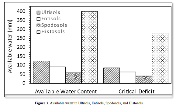 Soil texture is closely related to water availability in the soil. The highest water availability potential was found in Histosols, followed by Ultisols, Entisols, and Spodosols (Figure 3). Ultisols with a sandy loam texture had an available water value of 125 mm, Entisols with a loamy sand texture had available water of 91.7 mm, and Spodosol with a sand texture had available water of 58.3 mm. Histosols have the highest available water value at 400 mm. Although the available water value in Histosols is higher than that in Ultisols, Histosols have an irreversible drying property that causes the soil's ability to bind water to deteriorate, particularly during the dry season. Histosols (peat) that have undergone extreme drying will have difficulty absorbing water again, so the incoming water at that time cannot be stored.