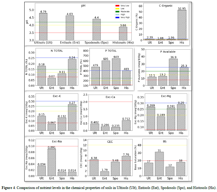 Soil chemical analysis for the fertility of oil palm plants shows significant variations in pH and organic content among soil types. Figure 4 shows a comparison of the nutrient levels in the chemical properties of soils in Ultisols (Ult), Entisols (Ent), Spodosols (Spo), and Histosols (His). The legend of the diagram indicates the categories of the chemical property analysis results, with red for very low category, yellow for low, green for moderate, light blue for high, and dark blue for very high. Histosols have the lowest pH at 3.88, indicating very high acidity and less ideal conditions for oil palm, while Ultisols show the highest pH at 4.79, more suitable for oil palm plants. Entisols and Spodosols also showed relatively high pH levels of 4.63 and 4.40, which are still acceptable. In terms of Organic C content, Histosols are very rich at 52.95%, far exceeding Ultisols and Spodosols, which have 2.39% and 1.96% respectively, while Entisols have the lowest at 1.08%. The highest Total N was found in Histosols (0.24%), followed by Ultisols (0.18%), and was lower in Spodosols (0.11%), with Entisols being the lowest at 0.07%. The most abundant total P was found in Spodosols (643%) and Entisols (605%), with Ultisols not far behind (479%), while Histosols, although the lowest at 403%, were still considered high.