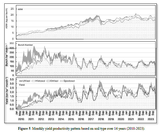 Figure 5 explains the oil palm production patterns over a 14-year mature phase (2010-2023), covering three (3) main parameters: ABW, number of bunches, and oil palm yield productivity. In 2010, the sampled oil palm reached four years old and began its harvesting phase for the first time, signifying its first maturity year (M1). This figure provides visual data that allows researchers and plantation managers to identify how differences in soil types specifically affect and correlate with these three production aspects. The production pattern in Ultisol is illustrated with a gray solid fill, whereas that in Histosol is marked with a white solid fill. Meanwhile, Entisol is represented by a dashed line, and Spodosols by a dotted line. Understanding the legend in Figure 5 enables an accurate interpretation to gain a comprehensive understanding of the dynamics of oil palm production based on soil characteristics.