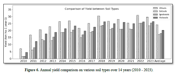 In Ultisols, S1V1 and S1V2 show no significant difference with yields of 23.68- and 23.99-tons ha-1 year-1, but S1V3 is superior with 25.10 tons ha-1 year-1, though not significantly different. In the Entisols, S2V1, S2V2, and S2V3 were stable at 17-ton ha-1 year-1 without significant differences. For Spodosols, S3V1 and S3V3 are similar with outcomes around 18 tons ha-1 year-1, while S3V2 is lower at 17.13 tons ha-1 year-1, yet comparable to Entisols. In Histosols, S4V1 and S4V2 produce approximately 20 tons ha-1 year-1 and are not significantly different from S4V3, although they are higher at 20.88 tons ha-1 year-1. Overall, it was observed that the highest yield was achieved in Ultisol soil with the Felda variety (S1V3), while the lowest yield was obtained in treatments with Entisols (S2V1, S2V2, S2V3) and Spodosols (S3V2). The variation in production across the 11 treatments reached 4-32% compared with S1V3.
