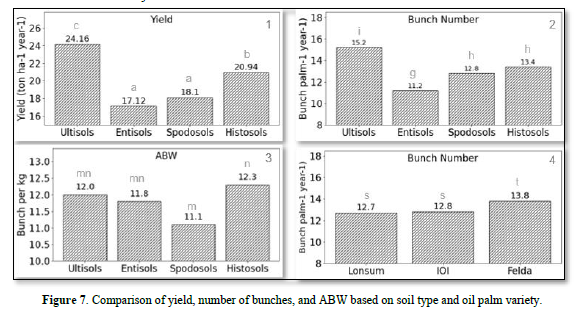 Previous studies have investigated the influence of variety and soil type on oil palm yield productivity separately, with diverse locations and conditions. Unlike previous approaches, this study specifically explored how four types of soil (Ultisols, Entisols, Spodosols, and Histosols) interact with three oil palm varieties to affect their productivity. This research aims to compare yield productivity, viewed from the number of bunches and ABW, among oil palm varieties grown in these four types of soil. Understanding and addressing the factors affecting oil palm yields can increase global oil production by approximately 15-20 million tons per year, thereby reducing the need for further expansion [1].