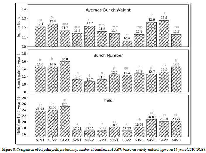 Soil type had a more dominant influence than variety in determining oil palm production. Ultisols are the best soil type for oil palm cultivation with an average yield productivity over 14 years reaching 24.23 tons FFB ha-1 year-1, whereas Histosols have 13% lower yield productivity (21.11 tons FFB ha-1 year-1), Entisols 26% (18.00 tons FFB ha-1 year-1) and Spodosols 29% (17.18 tons FFB ha-1 year-1) compared to Ultisols productivity. Varieties do not show a significant influence on yield and ABW, but there is a significant difference in the number of bunches with the Felda variety showing the best results with an average of 13.8 bunches palm-1 year-1 compared to Lonsum and IOI at 12.7 and 12.8 bunches palm-1 year-1 respectively. The combination of Ultisols and Felda provided the best results in terms of oil palm yield productivity at 25.10 tons FFB ha-1 year-1, with a production variation between 4% and 32% compared to the other 11 treatments. The varied yield productivity of oil palm across different soil types could be linked to the physical and chemical characteristics of these soils and their water availability. Ultisols offer the best conditions for oil palm growth, thanks to a balance between water retention, aeration, and nutrient availability. Histosols offer a large water storage potential but are hindered by low pH and reversible drying. Spodosols and Entisols, with a sand-dominated texture, face challenges in providing stable water and nutrient availability for oil palm.