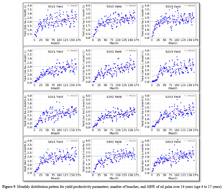 Figure 9 shows a scatter plot of yield for all treatments (S1V1-S4V3) over 14 years maturity phase, displayed in units of tons ha-1 month-1. The blue points represent the yield values for each treatment per month, whereas the red dashed lines depict a polynomial trend that shows the general production pattern over 14 years. The horizontal black dashed line indicates the monthly production target for oil palm plantations, which is approximately 2 tons ha-1 month-1. This line can be used to demonstrate how often a treatment meets or exceeds a set production target. The consistency of points above the black line indicates high yield productivity soil in those treatments, consistent with the results in Figure 9. The fluctuating pattern of production points also illustrates the variability in production, which might be influenced by various environmental factors or specific growth conditions during that period. The polynomial trend (red dashed line) attempts to closely model the actual production trend, allowing for future performance predictions based on historical data. However, it is essential to consider the plant phase because a decrease in oil palm production occurs during the Declining Yield Phase (DYP).