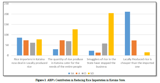 The objective of the study was to assess the contribution of Anchor Borrowers’ Programme in reducing the level at which rice was imported in Katsina State. The findings of this study which was based on the data generated directly from the beneficiaries of the programme, as seen in Figure 1 above tables indicates that most of the importers of rice in the State now turned to dealing in locally produced rice, which can be said to be a step forward, resulting from the introduction of ABP. However, this shifting did not mean the locally produced rice, which was cheaper, took the place of the imported one; but because the importers had no alternative other than to stop due harsh governmental policy on the business. This clearly meant that the reduction in the importation of rice into the State was not as a result of the introduction of the ABP but due government policy of banning the activity. Moreover, the qualitative data from the interviewees testified to this as they claimed that the stoppage of the importation was mostly by the policy enforced by the government not ABP’s impact. They explained that, had it been the programme had been in existence for at least five years before the import banning policy, people would not have been bothered. And by that time the State and the country in general would have been self-sufficient in rice production. In addition, the result of the tested hypothesis on this confirmed this as it showed that, even though this is a very slight correlation coefficient of 0.2, the tendency that ABP reduced importation of rice in the study area, if at all it did, was very minimal. Thus, the relationship was at its least stage. In a nutshell, the findings of the study showed that ABP’s contribution in reducing the importation of rice in the State, if it did, was not very significant.
