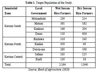 The population of this study constituted the entirety of the rice farmers in Katsina State who benefited by the Anchor Borrowers Programme (both wet and dry seasons farmers). Thus, the population of the study is 11,272 which are made up of wet season farmers (5,416) and dry season farmers (5,856). However, only the rice farmers who benefited by the programme from the selected nine local governments across the State-three from each senatorial zone-are used as the target population. This is shown in the following Table 1.