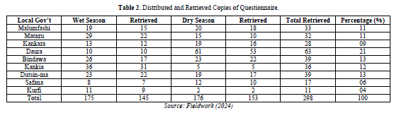Different sampling techniques are employed at different stages. First, simple random sampling method is employed in choosing the nine local governments-three from each of the three Senatorial Zones in the State. However, in selecting samples from the above chosen local governments, a systematic sampling technique is employed. In deciding the sample size meant for the study, Krejcie and Morgan formula is adopted which states that a population of 4,000 or thereabout requires a sample of 351, which is distributed among the selected local governments based on their number of beneficiaries. Copies of questionnaire are administered to the beneficiaries, while four persons are interviewed from the Ministry of Agricultural and Natural Resources Katsina State. The quantitative data collected via questionnaires was presented in a form of diagram containing the questions and responses. In testing the formulated hypotheses, Spearman’s Coefficient of Correlation is used, and the test is made by making use of Statistical Package for Social Sciences (SPSS) IBM SPSS Statistics 23.