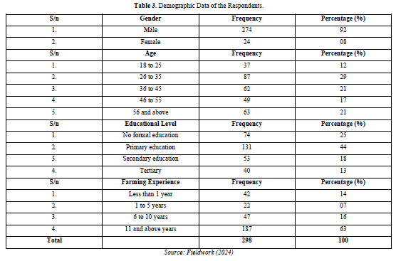 Data regarding the distribution of the sampled respondents by gender as indicated in Table 3 shows that out of the 298 farmers who returned the questionnaires administered to them, 274 equivalents to 92% are males. This shows that most farmers in the selected areas are male while the female dwellers in the areas are either subsidiary to males or do not know how to take part in any agricultural scheme through which they can access loans as well as all other benefits derivable form the programmes. The Table also indicates that farmers who benefited by the programme are of different categories in terms of age. Cumulatively, however, those below 45 years are much more than those that are above which means that most of the beneficiaries are able-bodied. This will make it possible for the programme to yield the desired result as it involved those who are capable to doing what is expected of them. Although, as seen in the Table, a considerable number of the respondents have only primary certificates as their highest qualification, it can clearly be comprehended that over 70% of them can at least be able to read and write in their mother tongue and to some extent in English which is an advantage to the programmes implementers. Regarding the number of years, the respondents have been in the business, it is a clear indication that the programme’s objectives can easily be achieved in the study area as almost 80% of the beneficiaries as seen in the Table have over 5 years farming experience. This means that majority of them do not require much training before they can produce desired result (Figure 1).