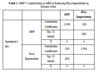 H1 There was a significant relationship between the ABP and the reduction of rice importation in Katsina State (Table 4).