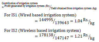 The above objective function is formed by knowing the contribution of both irrigation systems towards the net profit. It is the ratio of total income generated from yield of different irrigation system.