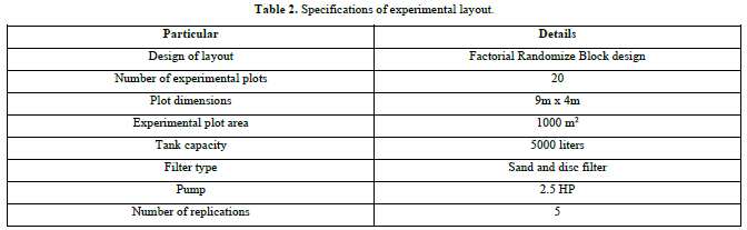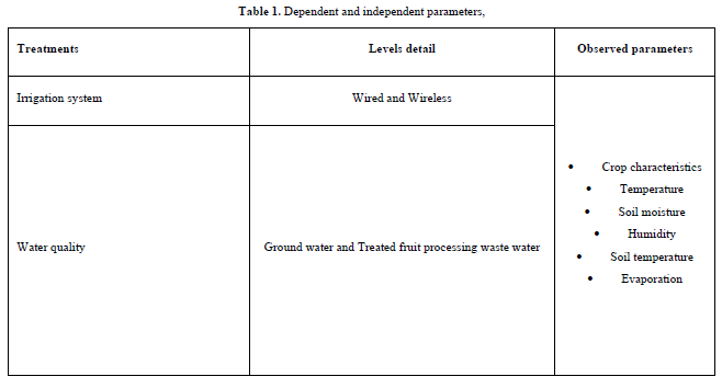 Two different irrigation sources were applied for growing tomato crop, through wired and wireless ADIS with five replications. Dependent and independent parameters are listed in Table 1 and the detailed specification of layout of experiment is shown in Figure 1 and Table 2. The details of treatments and sub treatments are given below: