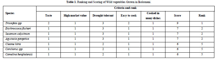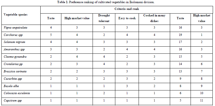The study also identified seven wild vegetables found in Ikolomani Division (Table 2). In order of priority, these were Triumfeta spp., Erythroccoca fischeri, Sesam calycinum, Agystasia gangetica and Cleome hirta. The others were Corchorus spp and Camelina benghalensis. The wild vegetable was consumed rarely especially during a serious food crisis such as severe drought. Tables 1 & 2 presented gives a summary of the ranking and scoring of wild vegetables grown in Ikolomani and the preference ranking of cultivated vegetables in Ikolomani division.
