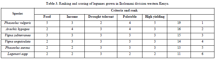 Table 3 below gives a summary of the ranking and scoring of legumes.