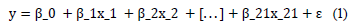 Where y = coffee score (dependent variable); x₁ = slope orientation to the sun; x₂ = latitude; x₃ = altitude; and, respectively, radiation, water deficit, Palmer Drought Severity Index (PDSI), precipitation, and maximum and minimum temperatures during the flowering, fruit filling, and maturation phases (independent variables). The coefficients β₀, β₁, ..., β₂₁ represent the intercept and the effect size of each environmental variable on the coffee score, quantifying how much the coffee quality changes with a unit variation in each factor. The term ε denotes the residual error, accounting for the variation in coffee quality not explained by the model. Only variables with statistically significant coefficients (P ≤ 0.1) were retained, ensuring that the selected factors meaningfully influence the final coffee quality (GRADE).