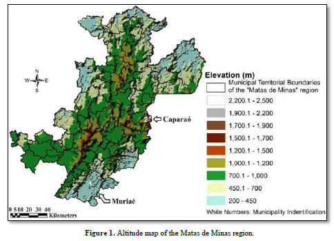 This study was conducted in the Mates de Minas region, located within the Atlantic Forest biome in eastern Minas Gerais, Brazil. The region is characterized by rugged terrain, with elevations ranging from 251 m (Muriaé) to 2,295 m (Alto Caparaó) (Figure 1). This altitudinal gradient directly influences local climatic conditions, affecting both coffee production and quality. The map in Figure 1 illustrates the elevation variation across the study area.