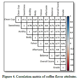 The sensory quality of coffee in the Matas de Minas region is largely shaped by environmental variables, including precipitation, solar radiation, water deficit, and air temperature [8-10]. These climatic factors exert a direct influence on key sensory attributes-particularly Flavor, Aftertaste, and Sweetness-which exhibit the strongest correlations with the overall sensory score.