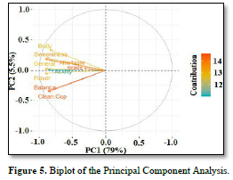 The application of Principal Component Analysis -(PCA) enables a more precise interpretation of the inter relationships between sensory attributes and beverage quality, facilitating the identification of key factors that define the sensory excellence of coffee produced in the region. Moreover, the reproducibility of these results across different coffee-producing areas supports the adoption of a standardized approach to specialty coffee characterization.