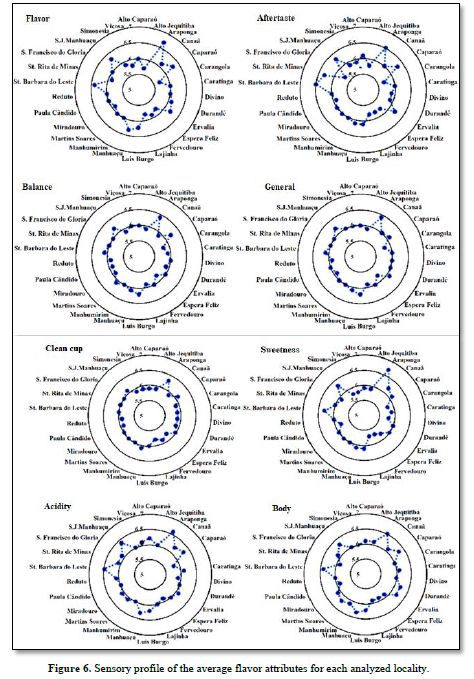 The Clean Cup attribute exhibited the highest degree of homogeneity across the evaluated localities, with average scores around 6. As illustrated in Figure 6, Araponga stands out with flavor attribute values exceeding 6.3, whereas Caratinga presents values equal to or below 6. This differentiation suggests that, due to the sensory balance among the analyzed attributes, the coffee produced in Araponga is of superior quality compared to Caratinga and other municipalities in the region.
