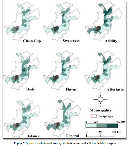 Sensory mapping serves as a critical tool for identifying regions with greater productive potential, facilitating the adoption of more efficient agricultural strategies and fostering the sustainable development of local coffee farming. By highlighting the specialty coffee potential of the Matas de Minas region, this spatial analysis plays a fundamental role in enhancing product quality. These insights enable producers to refine cultivation and processing techniques, ensuring consistency in desirable sensory attributes and maximizing the added value of their coffee in the global market.
